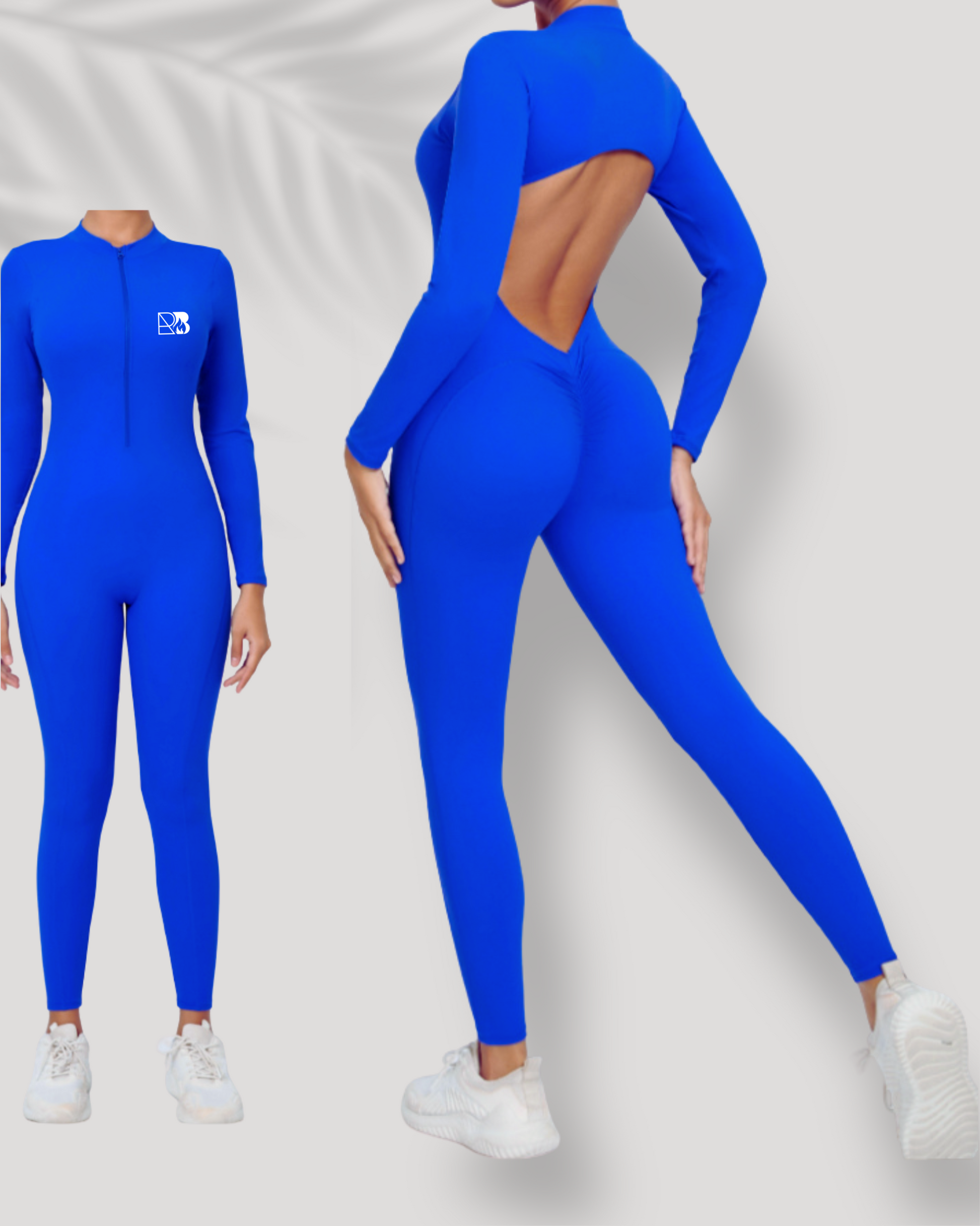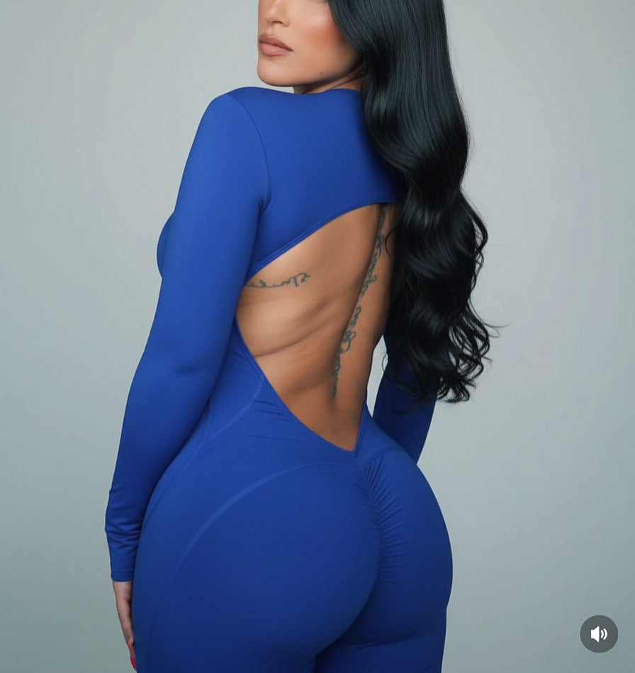 Enterizo azul con sostén integrado, zipper frontal y espalda descubierta …